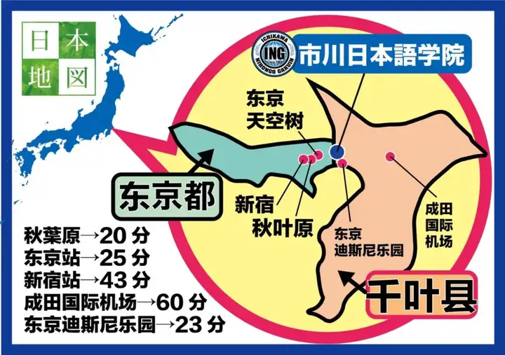 市川日本语学院是一所经日本语教育振兴协会、法务省入管局认定为优良校的日语专科学校。学院位于千叶县市川市中心,与东京都隔川相望。学院附近有3条电车线路,交通非常方便。学院与电车站之间只有3-6分钟的路程。从学校乘电车到东京车站只要25分钟,交通、通讯、生活都十分方便。
